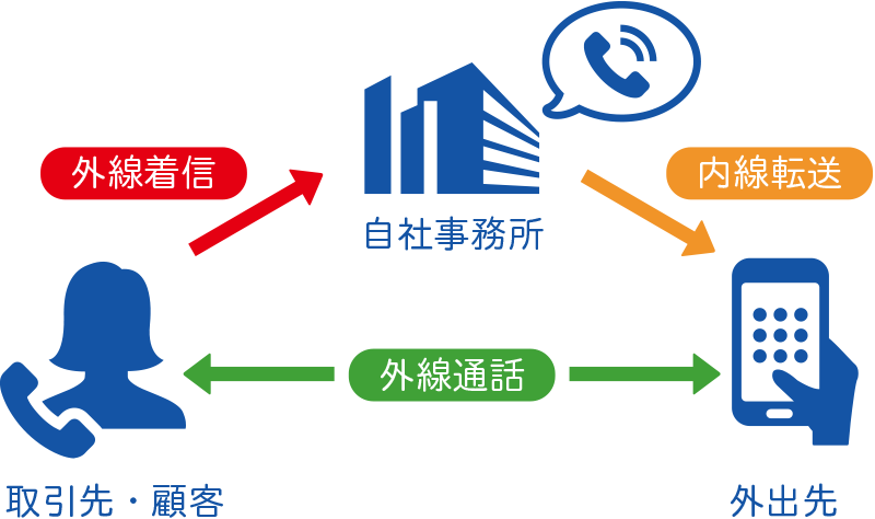 事務所に掛かってきた電話も外出先へ保留転送が可能です。