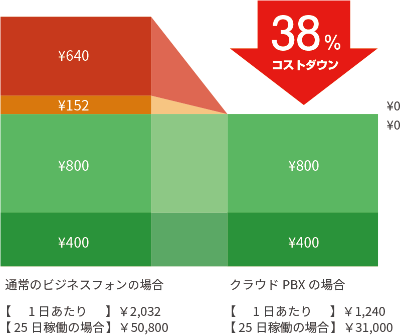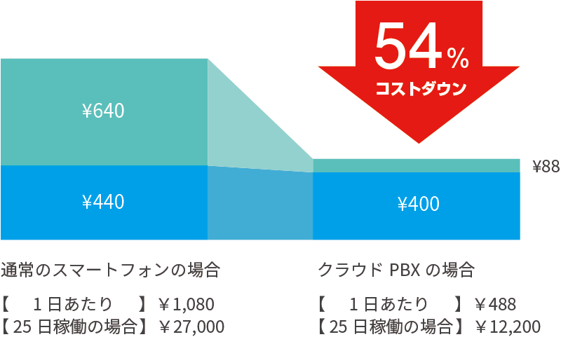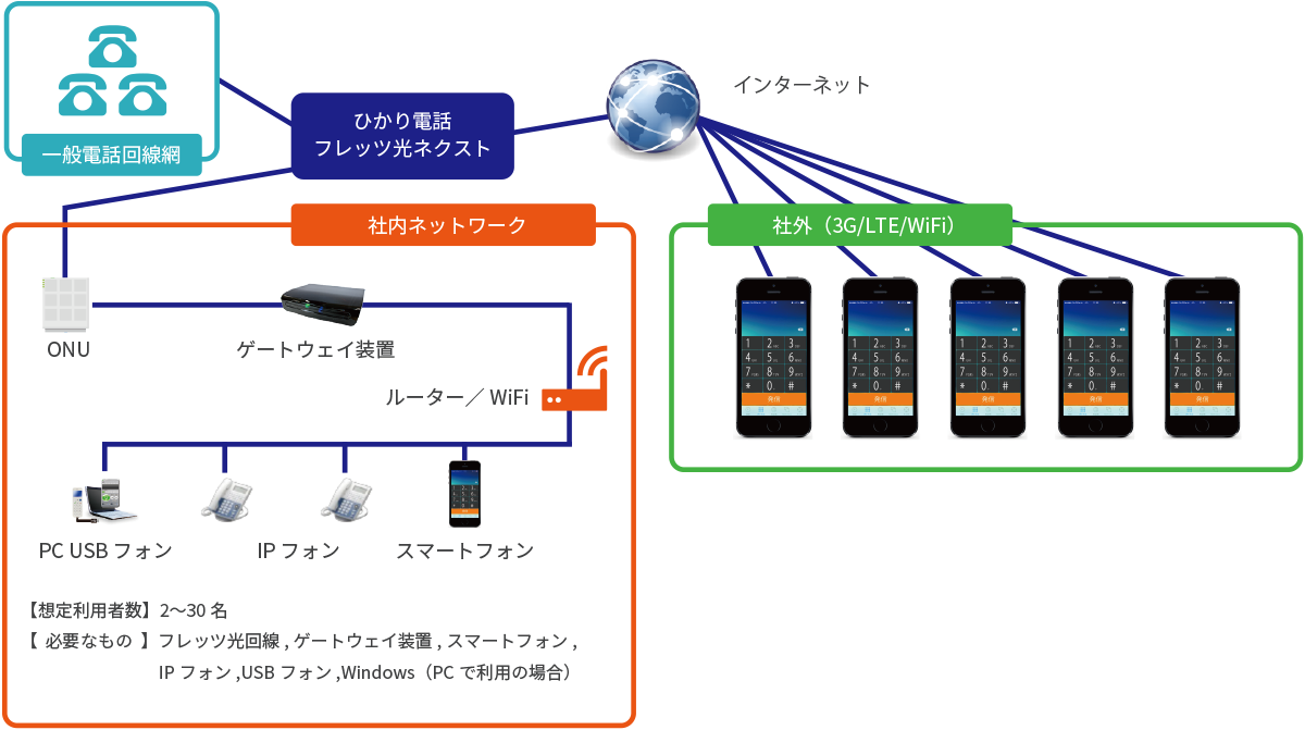 ビジネスフォンの代わりに、スマートフォンとクラウドサービスの連携で、内線通話や保留・転送などを実現します。