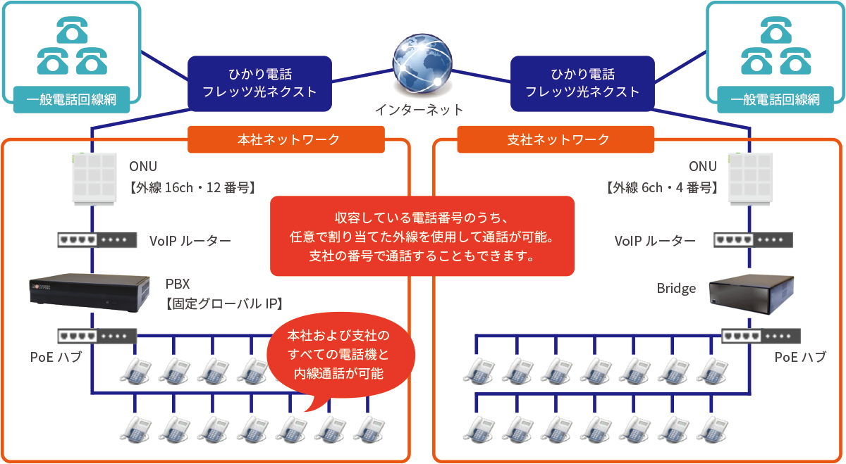 本社と支社の2拠点で、内線・外線を共有させるシステムを構築。最大で同時通話50ch、100内線(ID)の内線システムとなり、外線番号は無制限で登録可能。上記の例では、同時通話22ch・42内線(ID)、外線番号16番号を2拠点で共有し、どちらでもすべての外線番号の通話が可能で、もちろん無料の内線通話と保留転送を実施できるよう、構築しました。