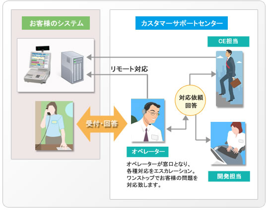 お客様のシステムに関する問い合わせのサポート窓口では、オペレーターによる24時間365日の障害受付を実施。ナレッジデータベースを活用し、プロフェッショナルなサポートでお客様を早期解決へと導きます。その後、障害内容を分析し、お客様に更なるシステム強化に向けた提案を行います。